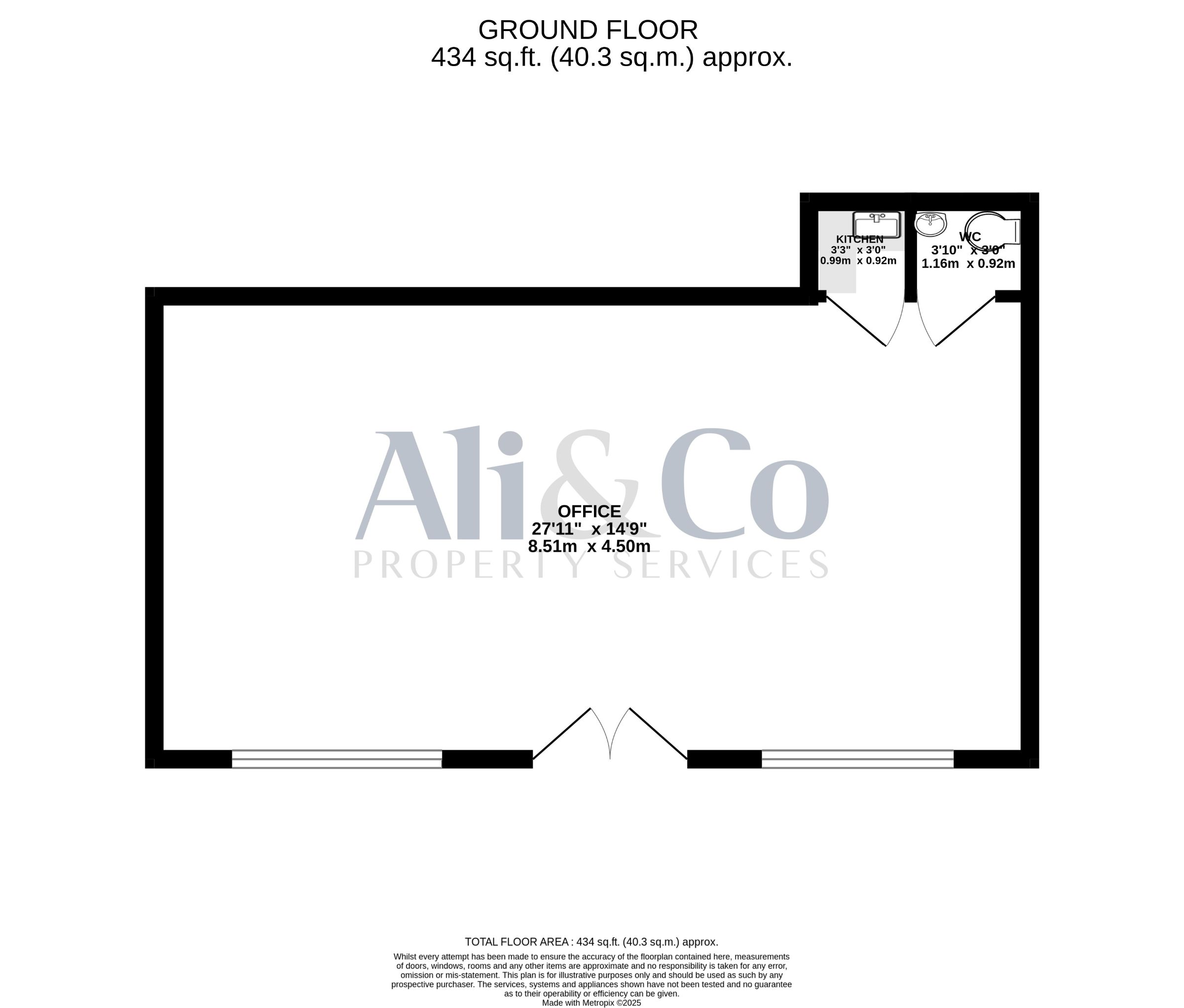 Office 1 w: 8.5m x l: 4.5m (w: 27' 11" x l: 14' 9")