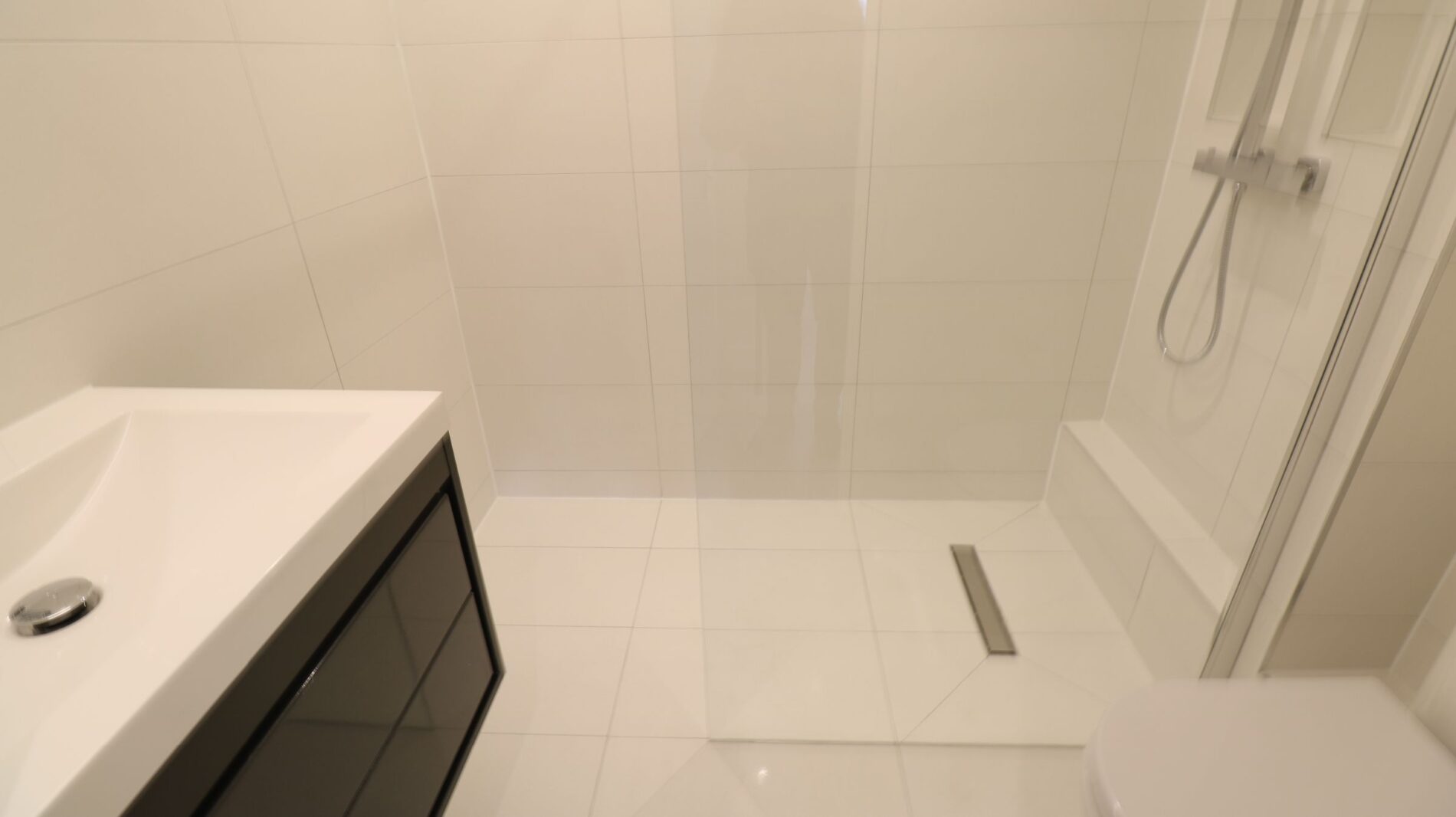 A modern walk in shower with modern sink unit and toilet.